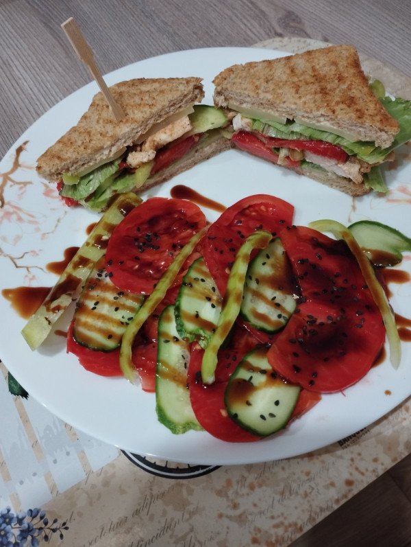 Kuracie mäso osolíme, okoreníme a na kvapke oliváču pečieme z oboch strán. Celozrnné toasty opečieme z oboch strán na suchej panvici. Na jeden toast dáme majonézu, ľadový šalát, kuracie mäso, eidam, paradajky, uhorky a zavrieme druhým toastom. Toast prerežeme na polovicu.
